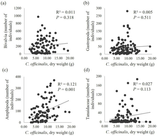 Scatter diagram of the total number of bivalves (a), gastropods (b), amphipods (c) and tanaidaceans (d) in relation to the dry weight of C. officinalis (g/25 cm2). With the corresponding regression lines (n = 96), the values of the coefficient of determination (R2) and the statistical significance of the slope coefficient (P) are displayed.