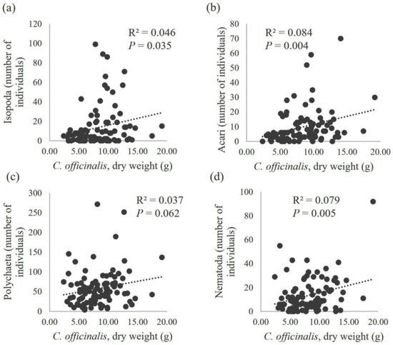 Scatter diagram of the total number of isopods (a), mites (b), polychaetes (c) and nematodes (d) in relation to the dry weight of C. officinalis (g/25 cm2). With the corresponding regression lines (n = 96), the values of the coefficient of determination (R2) and the statistical significance of the slope coefficient (P) are displayed.