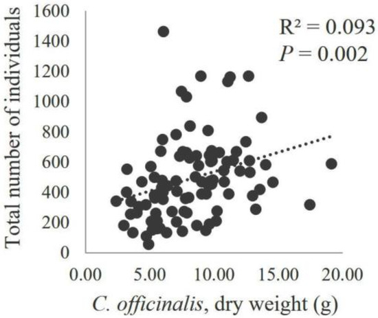 Scatter diagram of the total number of all recorded invertebrates in relation to the dry weight of C. officinalis (g/25 cm2). With the corresponding regression lines (n = 96), the values of the coefficient of determination (R2) and the statistical significance of the slope coefficient (P) are displayed.