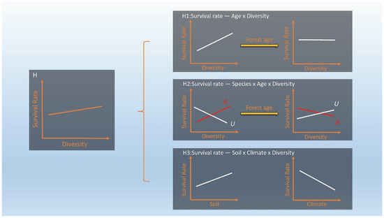 Conceptual diagram. Survival is calculated as the number surviving at the end of the interval divided by the number surviving at the start of the interval (usually expressed as a percentage and then referred to as survival probability rather than survival rate). H: Overall, stand diversity can improve tree survival. However, H1: The effects of stand diversity on survival vary with stand age. H2: Different species survival may have different responses to diversity and these may change with stand age (R and U are two example species, R indicates R. pseudoacacia, U indicates U. pumila). H3: The different responses of survival to diversity may depend on soil nutrient conditions. In addition, climatic conditions may also influence its variation.