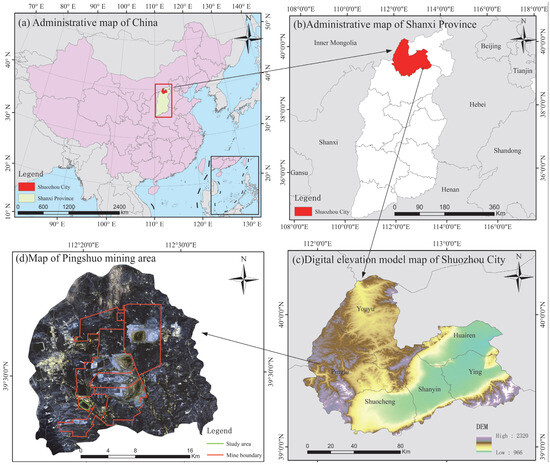 The study area is located at the fixed monitoring base in the south waste dump of China Coal Pingshuo Antaibao Mine in Pinglu District, Shuozhou City, Shanxi Province (Figure 2). The geographic coordinates of the area are 112°10′–113°30′ E and 39°23′–39°37′ N. The research region has a continental monsoon climate, characterized by dry, chilly, and low temperatures. The average annual temperature ranges from 5.4 to 13.8 °C. The annual precipitation in the area varies greatly, ranging from 345.3 to 682.2 mm. The zonal soils in this region are in the transition zone between chestnut-calcium soils and chestnut-calcium brown soils. Drought-tolerant plants such as Stipa bungcana (Perennial herbaceous plants of the genus Stipa in the Poaceae family), Stipa krylovii (Perennial herbaceous plants of the genus Stipa in the Poaceae family), Agropyron cristatum (Perennial herbaceous plants of the Gramineae family and the Ice Grass genus), Thymus mongolicus (Small semi shrubs of the genus Thyme in the family Labiatae), and Lespedeza davurica (Leguminous shrubs of the genus Lespedeza) are widely distributed in the area. Land reclamation efforts began in 1993, and in 2010, a permanent fixed monitoring base was established; monitoring is conducted every five years [35].