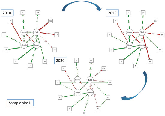The data regarding the effects of diversity, climate, and soil on species survival have been effectively analyzed using route analysis, as illustrated in the figure. In Figure 3, the path coefficient demonstrates that, between 2010 and 2015, there is an increase in the positive influence of soil on species diversity, as well as a rise in the negative impact of species diversity on survival rate. However, by 2020, the negative impact of species diversity on survival rate decreased, while the negative impact of soil on species diversity increased. This data highlights two key findings: firstly, species diversity consistently has a negative effect on species survival, regardless of changes in the coefficient intensity; and secondly, soil influences the intensity of the impact of species diversity on survival by affecting species diversity. Moving on to Site II (Figure 4), it can be observed that the impact of soil on species diversity also shifted from positive to negative with greater intensity between 2010 and 2015, as indicated by the path coefficient. Similarly, the impact of species diversity on survival rate changed from positive to negative with the same intensity. By 2020, species diversity was found to have a negative impact on species survival, mirroring the findings from Site I. Additionally, soil can change the intensity of the impact of species diversity on survival by influencing species diversity, as evident from the decrease in negative impact of species diversity on survival rate and the increase in negative impact of soil on species diversity.