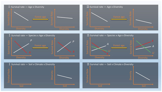 We observed that, while there were both positive and negative associations between species of different stand ages and diversity, only negative correlations were detected in terms of overall survival (Table 6 and Table 7, Figures S6 and S7).