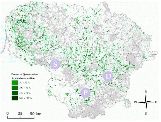 Map of Lithuania showing the position of study sites: P—Punia (N 54°30′50.1″, E 24°04′51.6″), D—Dūkštos (N 54°49′57.2″, E 24°57′15.0″), and Š—Šilinė (N 55°5′22.58″, E 22°57′ 13.85″). The map was reproduced with permission from FORESTGEN, www.forestgen.mi.lt (accessed on 5 September 2023).