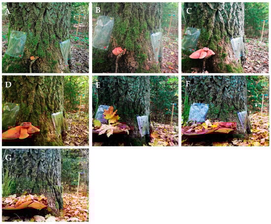 Development of Fistulina hepatica fruitbody. (A)—7 September 2022 (15-day-old fruitbody); (B)—13 September (21-day-old); (C)—21 September (29-day-old); (D)—27 September (35-day-old); (E)—5 October (43-day-old); (F)—12 October (50-day-old); and (G)—19 October (57-day-old). Plastic sheets in pictures were sticky traps used for collection of wood-colonizing insects (not this study). They did not interfere with the sampling of fungal spores.