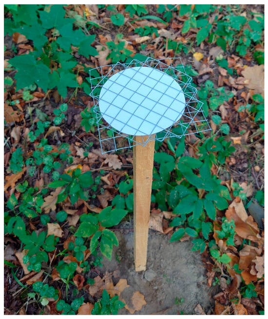 The selected oak stands were more than 200 years old. The oak stands at Punia and Dūkštos were similar in tree species composition as these were dominated by Q. robur with a small admixture of Picea abies and Alnus incana and with Corylus avellana, Sorbus sp., and Ulmus sp. in the understory. The ground vegetation consisted of Aegopodium podagraria, Urtica dioica, and Carex sp. At Šilinė, it was a pure old-growth oak stand with rare Prunus padus in the understory. The herbaceous cover consisted of Corex sp. Punia and Šilinė oak stands being on fertile binary soils of normal humidity, i.e., with groundwater deeper than 3 m from the surface. The Dūkštos oak stand was also on soils of normal humidity, but soil fertility was higher than in the other two oak stands of the study. The distance between individual study sites was >70 km (Figure 2). In all sites, the fruitbodies of F. hepatica were growing on the stems of living oaks at a height of 0.5–1.0 m from the ground. Fungal spores were collected using passive spore traps [,]. Each trap consisted of a 9 cm diameter Munktell filter paper (made of cotton stains, particle retention 5–6 μm, class 1F) (Ahlstrom-Munksjö, Stockholm, Sweden) that was sandwiched between two 10 × 10 cm stainless steel grills (mesh size 1 × 1 cm) that were attached horizontally to a 0.8 m long stick to anchor the trap to the ground (Figure 3 and Figure 4). Spore traps were placed at the end of August, i.e., just after the emergence of F. hepatica fruitbodies.