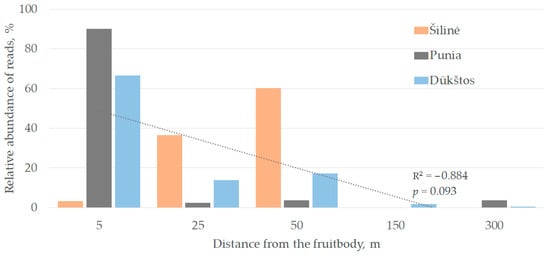 Although there was no significant correlation between the number of sequence reads and the distance from the fruitbody (Figure 5), in agreement with other studies, the results showed that there is a gradient of spore deposition from the fruitbody []. Stenlid [] showed that the gradient of spore deposition of Heterobasidion annosum (Fr) Bref., which is a common root-rot pathogen in temperate coniferous forests, is very steep within the first 100 m from the fruitbody. However, under extreme atmospheric conditions, its spores can travel up to 500 km.