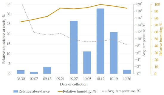 Relative abundance of Fistulina hepatica sequence reads, average daily temperature, and relative air humidity detected at different time points. All study sites and distances from the fruitbody are combined.