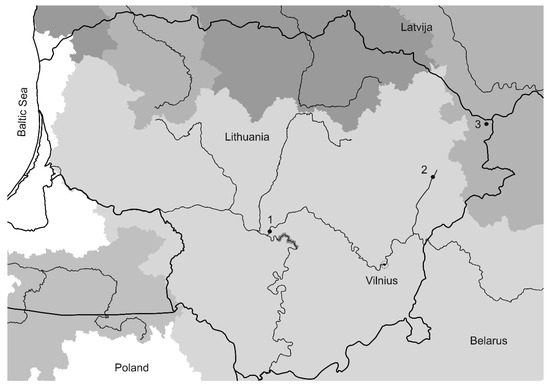 Drainage basins of the main rivers in Lithuania. Different river basins are highlighted in different shades. The locations of roach samples collected are represented by dots: the Neris River—1, Žeimena River—2, and Lake Drūkšiai—3.