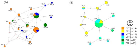 The D-loop haplotype network was constructed based on sequences of roaches collected in 2017, which displayed two common haplotypes (HD_5 and HD_8) separated by a single mutational step (Figure 2A). The common haplotype HD_5 was detected in 11 (26.2%) individuals from all three different locations, and HD_8 was found in 10 individuals (23.8%) from two locations (the Žeimena River and Lake Drūkšiai). Five years later, however, the number of detected haplotypes decreased in Lake Drūkšiai and the Neris River, but it remained unchanged in the Žeimena River (Figure 2B). A total of 15 variable sites were identified, and 26 haplotypes—based on mtDNA D-loop region sequences of the roaches from three locations (the Žeimena and Neris rivers and Drūkšiai Lake) collected in 2017 and 2022—were defined (Figure S1). The haplotype HD_5 was the core haplotype in roaches and appeared in 33 (39.3%) individuals representing all populations studied, including 2 individuals of D17, 4 of D22, 4 of N17, 7 of N22, 5 of Z17, and 11 of Z22. The second most abundant haplotype, HD_8, was detected in 10 individuals (11.9%) representing only the D17 and N17 populations collected in 2017. The lowest numbers of haplotypes and unique haplotypes were detected in the Z17 and Z22 (h = 4; h’ = 2) populations. The largest numbers of haplotypes and unique haplotypes were observed in D17 (h = 10; h’ = 6). Analyzing the haplotype networks of the roaches collected in 2017 and 2022 in each location, the results showed a classic star-like pattern with HD_5 as a center haplotype in the Neris and Žeimena rivers (Figure S2). In the case of Lake Drūkšiai, based on the mtDNA D-loop region sequences, fifteen different haplotypes, with two shared haplotypes among the 2017 and 2022 samples (HD_5 and HD_6), were detected. Eight unique haplotypes were observed in the D17 population and five in the D22 population.