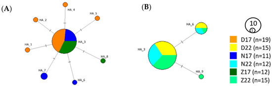 The haplotype network was constructed based on sequences of the roaches collected in 2017 (Figure 3A). The results showed seven unique haplotypes, four of which belonged to the D17 population (Figure 3A). Five years later, two haplotypes (HA_3 and HA_6) were observed in all locations studied, and only one singleton was detected in Z22 (Figure 3B). Based on ATP6 partial gene sequences, only eight variable sites were identified, and 9 haplotypes were defined among all of the 84 roach specimens studied (Figure S3). The haplotype network showed a star-like pattern with the main haplotype HA_3 identified in 69 (82.1%) individuals from all the populations studied. The largest number of haplotypes was also detected in D17 (h = 5) with four unique singletons. Classic star-like haplotype networks were observed in all studied locations (Figure S4). The haplotype network of Lake Drūkšiai and the Žeimena River displayed one common haplotype (HA_3), while two common haplotypes (HA_3 and HA_6) among the samples collected in 2017 and 2022 were detected in the Neris River.