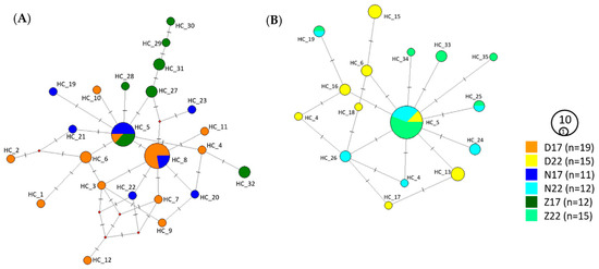 Median-joining haplotype networks of R. rutilus using mtDNA D-loop region sequences. (A) Haplotype network of roaches collected from three different locations in 2017; (B) Haplotype network of roaches collected from three different locations in 2022. Each circle represents a haplotype, and the size of a circle is proportional to the number of sequences assigned to that haplotype. The location from which the sequence was obtained is indicated by color in the legend. The number of hatch marks indicates the number of nucleotide differences that separate the haplotypes.