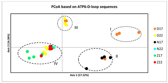 Genetic distance between 84 individual roaches was visualized through principal coordinates analysis (PCoA) based on concatenated ATP6 partial gene and D-loop region sequences (Figure 5). The first two principal coordinates explained 31.48% of the variation (17.12% and 14.36%, respectively). The results revealed that sampled specimens could be divided into four main groups. The first two groups consisted only of individual roaches collected in 2017 (D17 and D17, N17, respectively). The third group consisted only of fishes from Lake Drūkšiai collected in 2017 and 2022. The fourth group comprised representatives of all studied populations except the D17 population. Generally, D17 showed a separation from other populations, indicating a strong genetic differentiation from other populations.