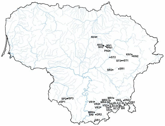 The prevailing land cover in the neighborhood of the sampled stand was recorded using Google Maps and by directly visiting the sites. The land cover type was assessed as seminatural (N)—undisturbed wetland or forest; urbanized (U)—in the vicinity of artificial surfaces, in most cases in urbanized territories; and agricultural (A)—near areas of intensive agricultural land use. Some hydro-chemical characteristics (pH, dissolved oxygen, BOD7 (biochemical oxygen consumption over 7 days), ammonium nitrogen, nitrite nitrogen, nitrate nitrogen, mineral nitrogen, total nitrogen (NT), phosphate phosphorus, total phosphorus, specific electrical conductivity), during the period of 9 years (2010–2018) were obtained from the Lithuanian EPA database [54]. Averages of the nine-year values of these indicators were used. River modification data were obtained from the Lithuanian EPA and Lithuanian Energy Institute [35].