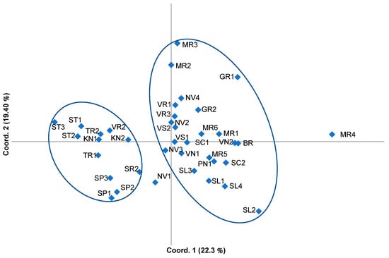 The sites were divided into two subgroups. Twenty-four sites formed the larger subgroup on the right side of the PCoA plot. A smaller number of sites (12), including all sites in Siesartis (ST1–ST3), Kiauna (KN1, KN2), Šešupė (SP1–SP3), Taurupis (TR1, TR2) and some other sites, formed a smaller subgroup on the left side of the plot. Some sites from the same river tended to cluster according to their origin. For example, this was typical for sites SP1–SP3, ST1–ST3 and SL1–SL4. The sites from other rivers were scattered on the plot. Sites in the Merkys River (MR2, MR3 and MR4) were especially genetically divergent. Although the sampling sites of some rivers tended to cluster together, their grouping was not related to the geographical location of the rivers.