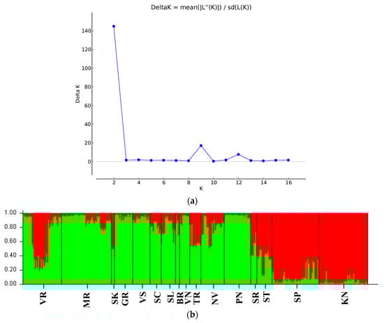 - Pritchard, J.K.; Stephens, M.; Donnelly, P. Inference of population structure using multilocus genotype data. Genetics 2000, 155, 945–959. [Google Scholar] [CrossRef]