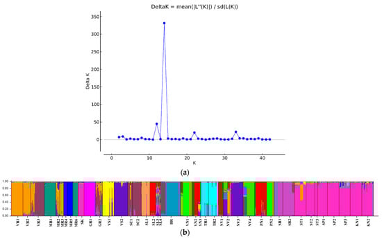 Analysis of the genetic structure of common reed at the level of sites: (a) Most likely number (K = 14) of genetic clusters of 42 sites of P. australis inferred by Evanno‘s Delta K method. (b) Genetic structure of P. australis sites (K = 14) revealed using the STRUCTURE program. Codes below the bar indicate sites according to Table 1. Each individual is represented by a thin line and its color depends on its partitioning into the K clusters. The plants of the same site are separated by black lines.