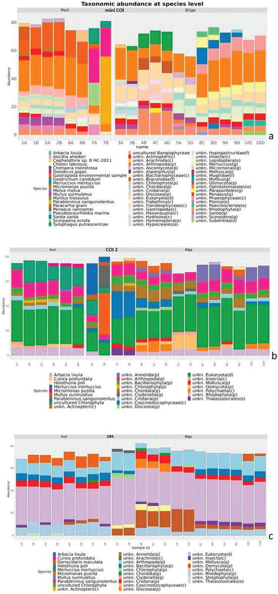 In the MiniCOI metabarcoding analysis, a large number of species within the phyla Arthropoda, Rhodophyta, and Oomycota were found in all samples. However, the presence of species such as the green alga Micromonas pusilla and the tunicate Ascidia ahodori stood out in the samples from the water extracted from the port samples. Species belonging to the classes Bangiophyceae and Bacillariophyceae were the most identifiable taxa in the taxonomic profiles of the samples extracted from the IF bilge water (8, 9, and 10), in addition to the fish Sarda sarda in the bilge samples (8 and 9). Finally, the mite Tyrophagus putrescentiae appeared in 10% of the port samples (4), while one IF port sample (7) showed a different species composition for the presence of fish such as Parablennius sanguinolentus, Mullus surmuletus, and Merluccius merluccius. Regarding the COI-2 and Cas analyses, despite finding some similarities, such as the high frequency of the phyla Artropoda and Rhodophyta, there were differences in the overall taxonomic composition. In the Cas group, there were species within the classes Bacillariophyta and Coscinodiscophyceae and the phylum Cnidaria. The presence of the fish Parablennius sanguinolentus in an IF port sample (7) with ~35% of the total classified reads is also noteworthy.