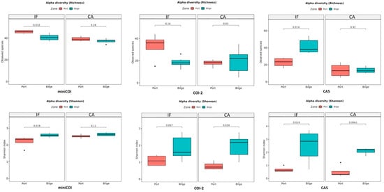 Alpha diversity calculated considering the total number of species in the three analyses showed different results between bilge and port water (Figure 3); it was higher in bilge water for Cas primer at IF and lower for COI-2 at IF. The Shannon index was always higher in bilge water than in port water (Figure 3).