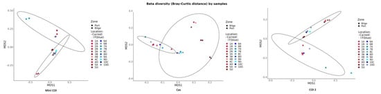 Multidimensional scaling (MDS) of the Bray–Curtis beta diversity metric shows that groups are clustered according to the extraction zone of each sample (bilge or port) in the case of MiniCOI, COI-2, and Cas (Figure 4).