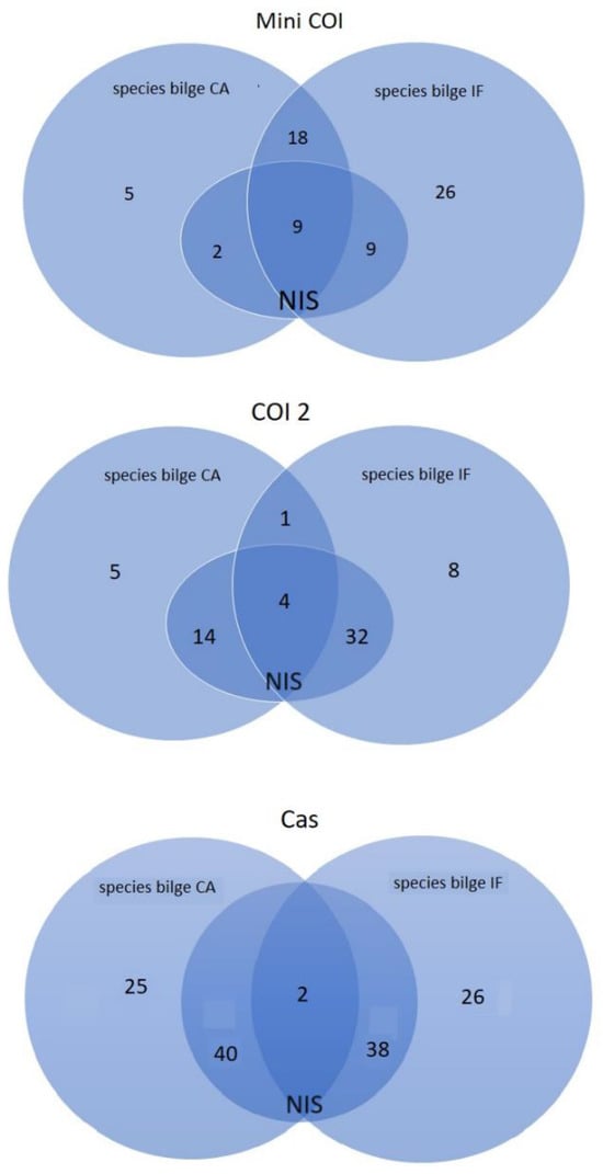 Furthermore, some of the identified marine species were found only in the bilge samples from CA or IF, and some were common to bilge from the two zones and were not present in the port water samples (Figure 5). In the bilge water, NIS was found in a percentage ranging from 15% to 80%, and the Cas primer set identified the highest percentage of NIS.