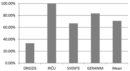 The average level of polymorphism in all studied Daphnia cucullata populations was the same and amounted to 100%, because all six analyzed microsatellite loci were polymorphic in all studied D. cucullata populations. The number of polymorphic loci of D. cucullata populations in the lakes Svente, Riča, Dridzis and Geraņimovas-Ilzas ranged from 33% to 100%. The lowest number of polymorphic microsatellite loci of the D. cucullata population was found in the Lake Dridzis (33%), while the highest number of polymorphic microsatellite loci was found in the lakes Riča (100%) and Geraņimovas-Ilzas (83%) (Figure 2).
