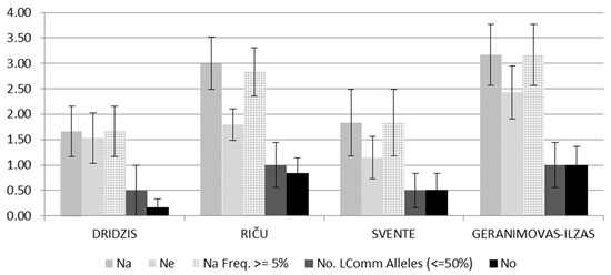 Allelic patterns across Daphnia cucullata populations between lakes Svente, Riča, Dridzis and Geraņimovas-Ilzas using microsatellites-PCR analysis (Na—the average number of alleles at the locus; Ne—the average effective number of alleles at the locus; Na ≥ 5%—average number of alleles with an incidence of more than 5%; No ≤ 50%—average number of alleles with an incidence of less than 50%; No—average number of private alleles; ± standard deviation).