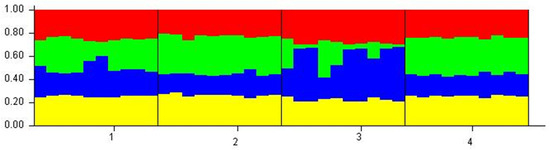 Bayesian clustering of individuals using STRUCTURE 2.3.4 [53] In the STRUCTURE analysis, color lines separate individuals from different sampling sites, and each individual is represented by a vertical line, which is partitioned into K-colored segments representing an individual’s estimated membership in K clusters (1—Dridzis, 2—Riča, 3—Svente, 4—Geraņimovas-Ilzas).