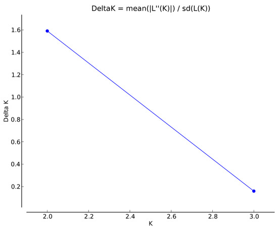 The number of clusters of individuals using Evano et al.’s clustering approach [56], assuming two genetic clusters (K = 2; ∆K = 1.59; InP(K) ± SD = −298.76 ± 78.73).