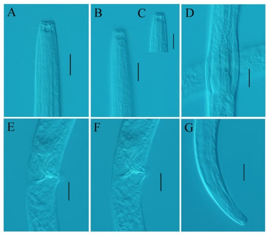 Desmolaimus magnus sp. nov. (A) lateral view of male anterior region showing buccal cavity; (B) lateral view of male anterior region showing amphidial fovea; (C) lateral view of male anterior region showing cephalic setae; (D) lateral view of male anterior region showing pharyngeal region; (E) lateral view of male posterior region showing spicules; (F) lateral view of male posterior region showing gubernaculum; (G) lateral view of male posterior region showing tail. Scale bars: (A–G) = 20 µm.