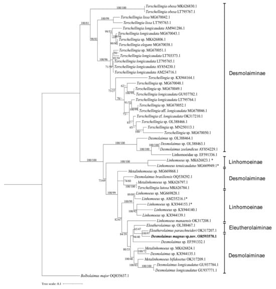 Four species of Desmolaimus have been identified to the species level: D. brasiliensis, D. longicaudatus, D. magnus sp. nov., and D. zeelandicus. They are shown as a paraphyletic group. D. magnus sp. nov. forms a highly supported clade with Eleutherolaimus paraschneideri Leduc & Zhao, 2023 in the topology trees based on both SSU and LSU sequences (100% posterior probability and 97% bootstrap value, 100% posterior probability and 100% bootstrap value, respectively). These two species share similarities in amphidial fovea position, absence of a pharynx bulb, gubernaculum shape, and a conical tail with truncated end. However, they can be easily distinguished by the presence or absence of a cuticularized ring in the buccal cavity and the arrangement of cephalic setae.