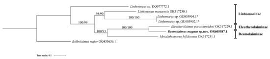 Bayesian inference tree within the family Linhomoeidae inferred from small subunit (SSU) sequences under the GTR(general time–reversible) + G (gamma distribution) model. Posterior probability on the left and bootstrap values on the right are provided for corresponding clades. The sequence obtained in this study is displayed in bold. Subfamilies are listed on the right. Note: * indicates species of the genus Paralinhomoeus accepted as Linhomoeus. The scale represents substitutions per site.