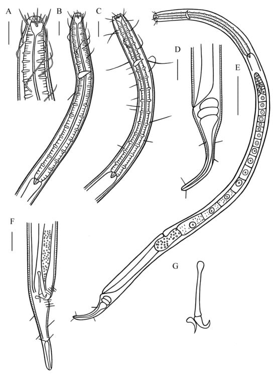 Metadesmolaimus robustus sp. nov. (A) lateral view of male anterior region showing cephalic setae and buccal cavity; (B) lateral view of male anterior region showing pharyngeal region; (C) lateral view of female anterior region showing buccal cavity and pharyngeal region; (D) lateral view of female posterior body, showing tail; (E) lateral view of female entire body showing vulva; (F) lateral view of male posterior body, showing spicules, gubernaculum and tail; (G) spicules and gubernaculum. Scale bars: (A–D,F) = 30 µm; (E) = 100 µm.