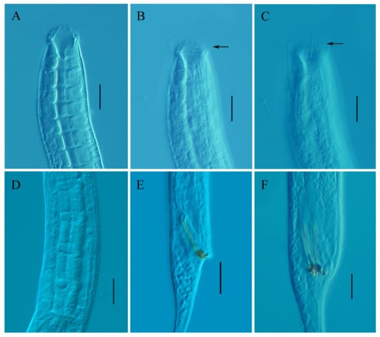 Metadesmolaimus robustus sp. nov. (A) lateral view of male anterior region showing buccal cavity; (B) lateral view of male anterior region showing inner labial sensilla and cuticularized rings (arrow); (C) lateral view of male anterior region showing ventrolateral setiform (arrow); (D) lateral view of female anterior body, showing pharyngeal region; (E) lateral view of male posterior region showing spicules; (F) lateral view of male posterior region, showing gubernaculum. Scale bars: (A–F) = 20 µm.