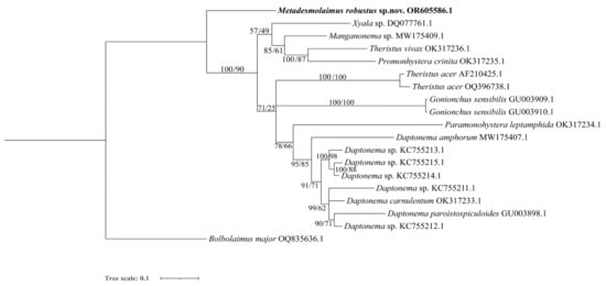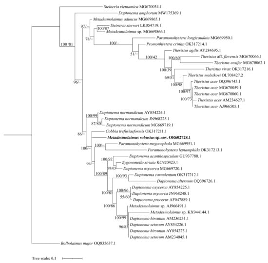 Nematodes are the most abundant and diverse group among meiofauna animals and play important roles as various trophic guilds. The estimated number of nematode species ranges from half a million to ten million, and only 1% to 5% of these species have been identified []. Phylogenetic relationships among nematodes are still not well understood due to the scarcity of available molecular sequences deposited in GenBank. Linhomoeidae Filipjev, 1922, and Xyalidae Chitwood, 1951, are the two most complex families in the order Monhysterida. Genera among them are morphological similar, and genus relationships between Metadesmolaimus Schuurmans Stekhoven, 1935 and Daptonema Cobb, 1920, as well as between Metadesmolaimus and Theristus Bastian, 1865, have been a source of confusion for a long time [,,].
