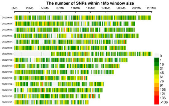 Based on SNP, the population structure of the samples was analyzed through admixture 1.3 software, and the clustering was performed via assuming that the number of clusters (K value) of the samples was 1–10. SPAGeDi 2002 software can be used to estimate the relative kinship between two individuals in a natural population. Through using RAxML Version 8 software, a phylogenetic tree of the samples was constructed based on the maximum likelihood method [24]. Then, gcta 1.91.7beta software was used to perform PCA clustering on the samples, which was then combined with the phylogenetic tree and genetic structure diagram obtained from the above analysis to view the stratification of the population. The vcf-tools program was used based on the sliding window method (the window was set to 3 kb) to calculate the expected heterozygosity (He), nucleotide diversity (Nucleotide Diversity, Pi) and the inbreeding coefficient (Inbreeding Coefficient of an Individual Relative to the Subpopulation, Fis). Lastly, the Shannon–Wiener diversity index, shannon_Index, was used for analysis [25,26,27].