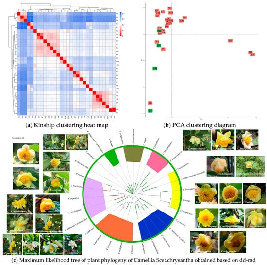 As can be seen from Figure 2c, based on the maximum likelihood method, a phylogenetic tree of all samples—based on the maximum likelihood method—was constructed, and it intuitively displays the classification of the samples. The phylogeny based on whole-genome data was well resolved, thereby improving the level of resolution to species and within the species, with at least seven reticulation events in the plants of the Chinese Camellia Scet.chrysantha. In the nuclear-dd-RAD tree, Camellia nitidissima, Camellia nitidissima var.microcurpa, Camellia euphlebia, Camellia tunghinensis and Camellia rostrata came together; Camellia limonia, Camellia xiashiensis, Camellia multipetala, Camellia parvipetala and Camellia micrantha came together; Camellia achrysantha, Camellia longzhouensis, Camellia multipetala var. Patens, Camellia perpetua and Camellia quinqueloculosa grouped together; and Camellia debaoensis, Camellia fascicularis, Camellia mingii, Camellia pingguoensis var. terminalis and Camellia wumingensis were grouped together. Furthermore, among them, Camellia debaoensis, Camellia fascicularis and Camellia mingii were found to be closely related. Camellia impressinervis, Camellia longgangensis and Camellia ptilosperma were closely related and were grouped together. Camellia flavida, Camellia huana, Camellia libelofifilamenta, Camellia pingguoensis and Camellia tianeensis were grouped together. Camellia pubipetala and Camellia chrysanthoides were, with their thin leaves, a branch.