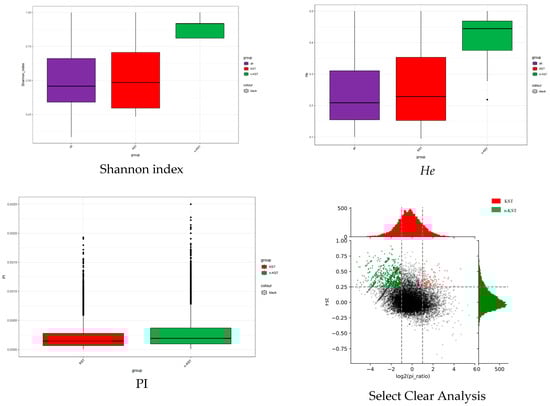 Camellia Scet.Chrysantha plants are widely distributed in karst landforms, and the phenotypic characteristics of plants are affected by the combined effects of genetic genes and the environment. Research on the genetic diversity of golden camellia plant species in karst and non-karst areas will help reveal the factors influencing the phenotypic characteristics of Camellia Scet. Chrysantha plants [25]. The Shannon–Wiener diversity index is an index used to investigate the diversity (α-diversity) of plant communities in local habitats. It can also be used to measure the polymorphism of SNP sites. As can be seen from Figure 3, the genetic diversity index (0.892) in non-karst areas was higher than that in karst areas (0.531). The high genetic diversity of golden camellia was preserved in non-karst areas. The higher the expected heterozygosity value He, the lower the genetic consistency and the richer the genetic diversity of the population. The results showed that the He value (0.259) in karst areas was lower than that in non-karst areas (0.396). The PI values ranged from 0 to 1, with larger values representing higher diversity and smaller values representing lower diversity. The PI value of golden flower tea in karst areas was 0.0002 and that in non-karst areas was 0.00027. Selection elimination analysis was conducted based on two indicators: Fst and PI. The window (3 kb sliding window along the genome) where Fst between different subgroups is greater than 0.25 and log2 (PI ratio) is greater than 1 or less than −1 is subject to strong selection. Regions of stress that are Related to differentiation between different subpopulations, as well as the distribution of genes in these regions, may be associated with the phenotypic differences between the two groups. As can be seen from Figure 3, golden camellia genes in karst areas were selected by the karst natural environment, and polymorphisms were eliminated in order to adapt to the special karst habitats; the genetic diversity of the areas where the species were selected and eliminated was significantly reduced.