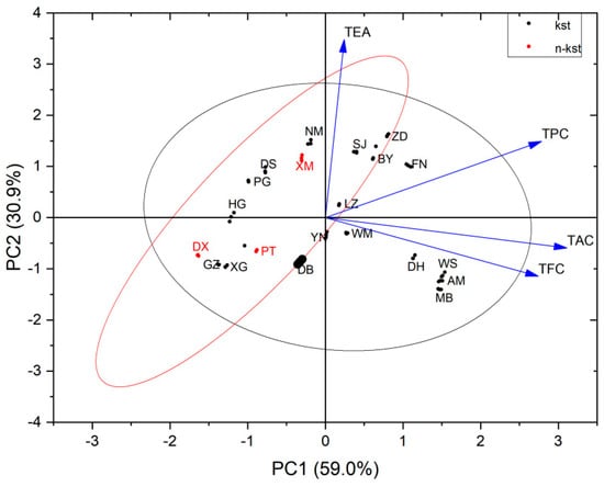Phenols and flavonoids are secondary metabolites of plants that contain at least one aromatic ring and a hydroxyl group; these compounds play an important physiological role in preventing the action of free radicals [41,42]; therefore, they can be used as preventive agents in the human body. They are a good source for treating cardiovascular disease [43,44], cancer [45,46,47], diabetes [48], weight loss and lipid lowering [49,50], and neurodegenerative diseases [51,52]. Using gallic acid and rutin as standards, the total phenolic content (TPC) and total flavonoid content (TFC) of each extract were determined using a colorimetric method with gallic acid and rutin as the standards. The results show that the active ingredients of golden camellia with a karst distribution and non-karst distribution were quite different. The average contents of the total phenols, total flavonoids, total proanthocyanidins and ellagic acid of golden camellia with a karst distribution were 2.339 g/100 g, 0.035 g/100 g, 2.640 g/100 g and 4.891 g/100 g, respectively. These values were all significantly higher than the average contents of the total phenols (1.471), total flavonoids (0.026), total proanthocyanidins (0.616) and total ellagic acid (2.189) in the non-karst distributed golden camellia.