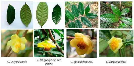 The Camellia Sect. Chrysantha is a group with yellow flowers in the genus Camellia of the family Theaceae. Its precious and rare yellow gene fills the gap in the yellow camellia that is coveted by horticulturists. It has essential ornamental value and scientific research value. It is known as the “Queen of the Tea Clan”, the “Giant Panda of the Plant World” and the “Fantasy Yellow Flower Tea”. It is also called “Oriental Magic Tea” abroad [1,2,3]. Since golden camellia was discovered, it has been widely used in the hybrid breeding of yellow camellia and experimental research on cultivating excellent new varieties of hybrid camellia. Chinese experts and scholars have developed new varieties “Liaoyan Beauty”, “Nayue Hongyan”, “Xinhuang”, “Jinbei Danxin”, etc. [4,5]; and Japanese horticulturalists have cultivated new varieties such as “Chuhuang”, “Golden Star” and “Kimiko” et al. [6,7], which has greatly enriched the new tea variety market. Golden camellia is not only a high-quality camellia germplasm resource, but also a natural tea drink. It is one of the plants with the richest medicinal and nutritional value. The leaves and flowers of golden camellia are not only rich in active ingredients such as polyphenols, flavonoids, saponins and polysaccharides, but also rich in trace elements such as iron, selenium, copper, zinc, vanadium and natural organic germanium. It also has other important health care effects on the human body [8,9,10]. “Guangxi Zhuang Autonomous Region Zhuang Medicine Quality Standards” (Volume 2) records that golden camellia is slightly bitter and astringent, and it has the functions of clearing away heat and detoxification, diuresis and swelling, lowering blood sugar and cholesterol, preventing tumors, and anti-aging [11,12]. In 2010, the Chinese Ministry of Health approved golden camellia as a new resource of food, and it has been widely developed into scented tea, drinks, medicines, cosmetics, handicrafts, etc. Furthermore, its products have also sold well in domestic and foreign markets [13].