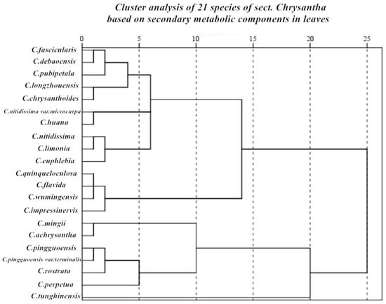 Cluster analysis was performed on 21 species of golden camellia using the content of the four effective active ingredients in the leaves of Camellia Sect. Chrysantha plants as parameter combinations (Figure 7). The results showed (Figure 2c) that the dendrogram results were significantly consistent and had a corresponding relationship with the molecular clustering of Camellia Sect. Chrysantha plants. When the distance coefficient was 5, the overall classification could be divided into seven categories. The first category included Camellia fascicularis, Camellia debaoensis, Camellia pubipetala, Camellia longzhouensis and Camellia chrysanthoides; the second category included Camellia nitidissima var. microcurpa and Camellia hauna; the third category included Camellia euphlebia and Camellia nitidissima; and the fourth category included Camellia quinqueloculosa, Camellia flavida, Camellia wumingensis and Camellia impressinervis. These kinds of plant nutrient contents saw the highest relative nutritional value among all the kinds of golden camellia species. Category 5 included Camellia mingii and Camellia achrysantha; Category 6 included Camellia pingguoensisa, Camellia terminalis, Camellia rostrata and Camellia perpetua; and Category 7 included Camellia tunghinensis (which has a relatively low phytonutrient content and a relatively low medicinal value). The research results of the cluster analysis of the active chemical ingredients also proved the classification relationship of dd-RAD—the clustering relationship between Camellia fascicularis and Camellia debaoensis was relatively close; the relationship between Camellia nitidissima, Camellia limonia and Camellia euphlebia was consistent; Camellia wumingensis and Camellia impressinervis were clustered in the same way; and Camellia pingguoensis, Camellia pingguoensis var. terminalis and Camellia pubipetala were clustered together as a whole and were consistent. Based on the cluster analysis of four active ingredients, the similarity rate with Min’s classification system was relatively high [62]. The classification relationship of Camellia nitidissima, Camellia euphlebia and Camellia nitidissima var. microcurpa was similar; moreover, the classification relationship of Camellia flavida and Camellia hauna was also similar. Similarly, Camellia pingguoensis var. terminalis, as a variant of Camellia pingguoensis, can be defined as a species; however, Camellia tunghinensis is a separate category. The diversity and particularity of a species will inevitably lead to a diversity and particularity in the types of phytochemical components. The diversity of the phytochemical components will inevitably lead to a diversity and particularity in biological activities. The distribution of secondary metabolites in the tree of life, if it is selective, will definitely show certain phylogenetic signals [63,64]. Therefore, we can analyze and evaluate the evolutionary relationships between plant groups through the distribution characteristics of secondary metabolites on the evolutionary branches on the plant phylogenetic tree (or tree of life), thereby providing evidence for plant classification and phylogenetic evolution.