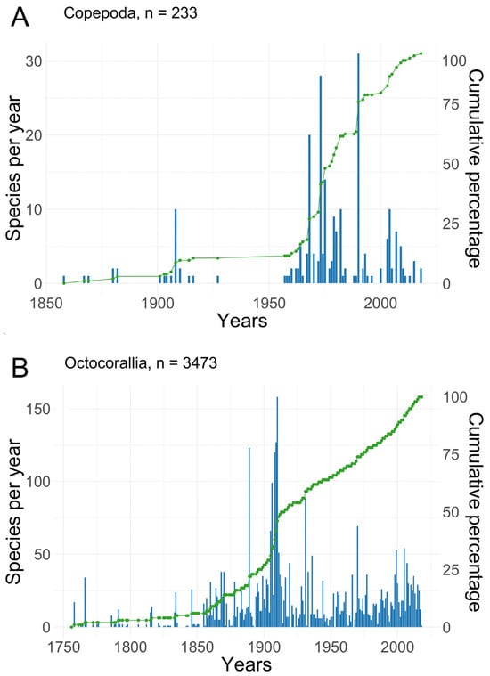 Numbers of new species and cumulative percentage (green line) of known species of (A) octocorals and associated with them (B) symbiotic copepods described published over time. Based on the WoRMS database [].