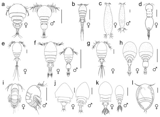 Habitus of copepod crustaceans living on octocorals: (a)—Panjakus auriculatus (Anchimolgidae), dorsal view, scale bar 0.5 mm []; (b)—Hippomolgus latipes (Clausidiidae), dorsal view, scale bar 0.5 mm []; (c)—Enalcyonium digitigerum (Lamippidae), dorsal view, scale bar 0.1 mm []; (d)—Paranotodelphys procax (Notodelphyidae), dorsal view, scale bar 0.2 mm []; (e)—Tubiporicola inflatus (Pseudanthessiidae), dorsal view, 0.5 mm []; (f)—Paramolgus litophyticus (Rhynchomolgidae), dorsal view, 0.5 mm []; (g)—Eupolymniphilus brevicaudatus (Sabelliphilidae), dorsal view, 0.2 mm []; (h)—Forhania philippinensis (Thamnomolgidae), dorsal view, 0.4 mm []; (i)—Parategastes conexus (Tegastidae), dorsal view, 0.2 mm []; (j)—Cryptopontius phyllogorgius (Artotrogidae), dorsal view, 0.2 mm []; (k)—Orecturus finitimus (Asterocheridae), dorsal view, 0.3 mm []; (l)—Entomopsyllus takara (Entomolepididae), dorsal view, 0.2 mm [] (a–h)—Cyclopoida, (i)—Harpacticoida, (j–l)—Siphonostomatoida.