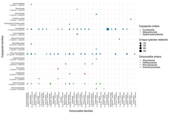 Number of records per association of symbiotic copepod families with octocoralian families. Size of figure means number of records. Color of figure means order of copepods.