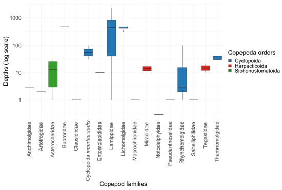 Distribution of symbiotic copepods associated with octocorals by depth (see also Table 5, Table A1 and Table S1). The horizontal line within each box represents the median of the dataset. The box defines the interquartile range, covering the 25th to 75th percentiles. Whiskers extending from each box show the minimum and maximum data values. Data points appearing outside of these whiskers are identified as outliers.