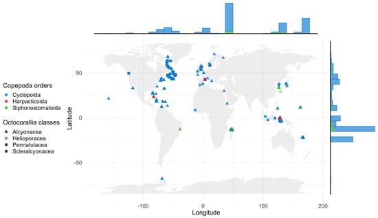 The absence of published records from vast territories such as the Tropical East Pacific, Temperate South America, Temperate South Africa, and Temperate Australia ecoregions may be due to a lack of infrastructure, such as research stations, like it has been described in other groups of aquatic invertebrates [,], creating a shortage of specialists with expertise in microscopic copepods [] (Figure 5, Table 1, Table 5, Table A1 and Table S1). The prevalence of copepods symbiotic with octocorals in the tropical Indo-Pacific region could be partially attributed to greater research activity in this area and the relatively high diversity of shallow-water alcyonaceans.