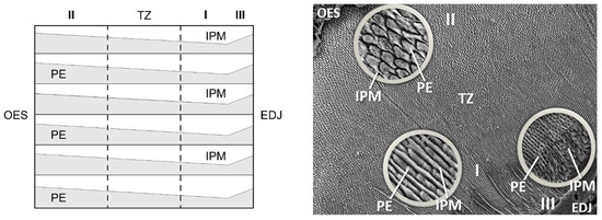 Diagram of the enamel structure of molars. I, II, III—types of enamel structures. TZ—transitional zone. OES—outer enamel surface. EDJ—enamel-dentine junction. PE—enamel prisms. IPM—interprismatic matrix.