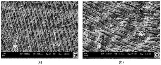 Enamel structures display divergences within the analyzed forms, and our study demonstrates their taxonomic importance, especially for the Equidae family. In the case of horses, the tooth enamel predominantly displays a radial structure, which can be classified into three distinct types (I, II, III) [7]. The first enamel type is consistently positioned closer to the enamel–dentine junction (EDJ). It constitutes approximately 40% of the overall tooth enamel layer and is characterized by rows (strands) of prisms (PE) and matrix structures (IPM) arranged in parallel and sequential fashions (Figure 1). The prisms tend to aggregate in clusters, resembling lens-like structures (isolated prisms being a rare occurrence), and are consistently oriented in a tilt towards the EDJ. The rows of IPM in type I molar teeth display a weaker or less pronounced crystal structure, with a tendency to divide the rows towards the outer enamel surface (OES). These IPM rows are wider and thicker than the PE rows. Additionally, the thickness of both PE and IPM rows proportionally varies as one approaches the enamel–dentine junction (EDJ).