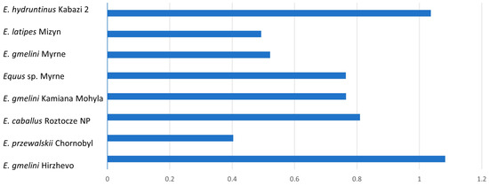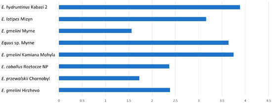 Another noteworthy pair consisted of E. latipes from Mizyn and E. przewalskii from the Chornobyl Exclusion Zone, both of which were positioned on divergent branches of the decision tree. Similarly, despite having a similar mean K-index, this pair was categorized into different groups based on the K-W test, they were significantly different according to Nemenyi’s test, and placed opposite each other on the decision tree. The next important difference is to be found between E. caballus from Roztocze NP and E. latipes and E. hydruntinus.