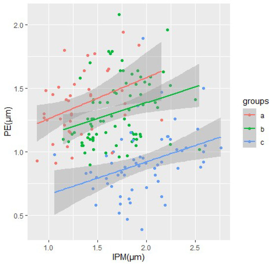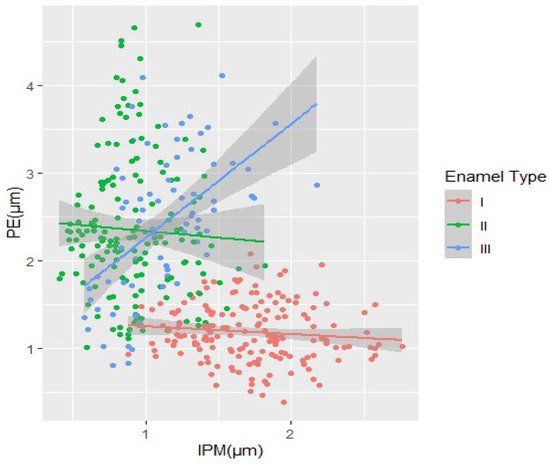 Morphometric data on the structure of different enamel types were also analyzed to determine trends of change and the interrelationship between the enamel prisms (PE) and interprismatic matrix (IPM) in each enamel type for all the studied forms together. This analysis was aimed at better understanding the evolution of enamel structure and the relationship between different equine species (Figure 6).